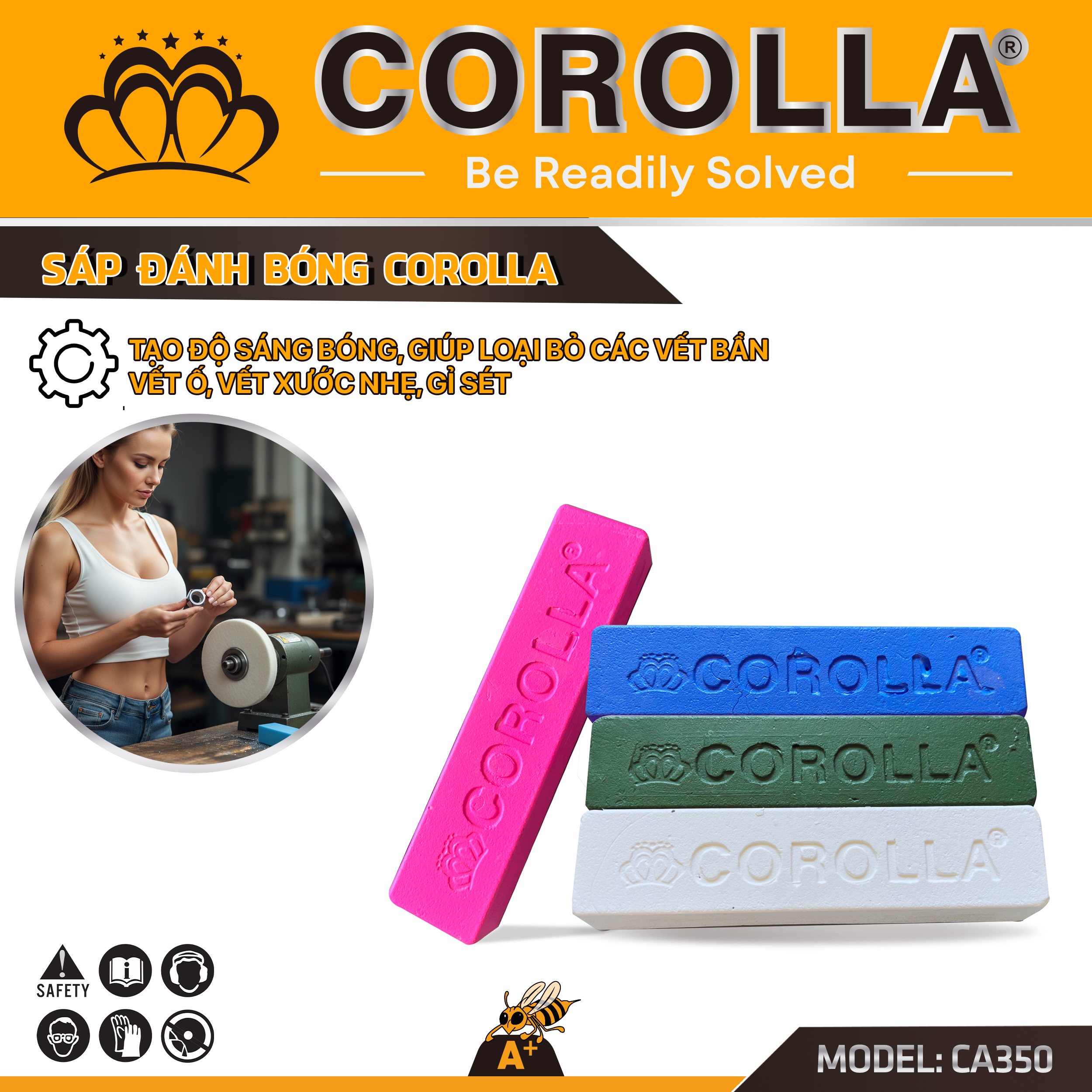 Sáp đánh bóng COROLLA là dòng phụ trợ cao cấp không thể thiếu trong quy trình xử lý bề mặt Inox và kim loại màu. Sản phẩm giúp tăng cường hiệu quả cắt mài và tạo độ bóng gương sâu, bảo vệ bề mặt phôi khỏi các tác động oxy hóa.