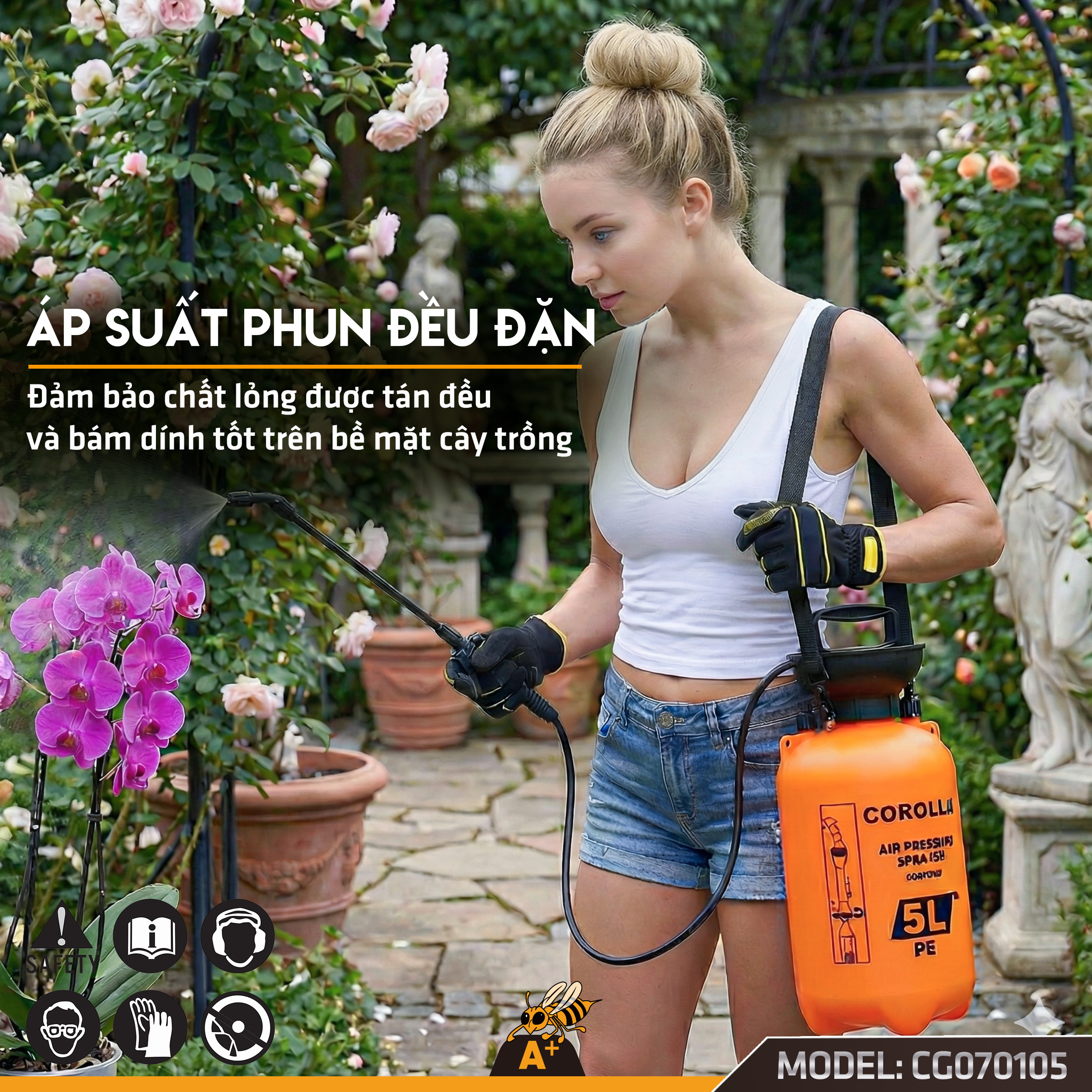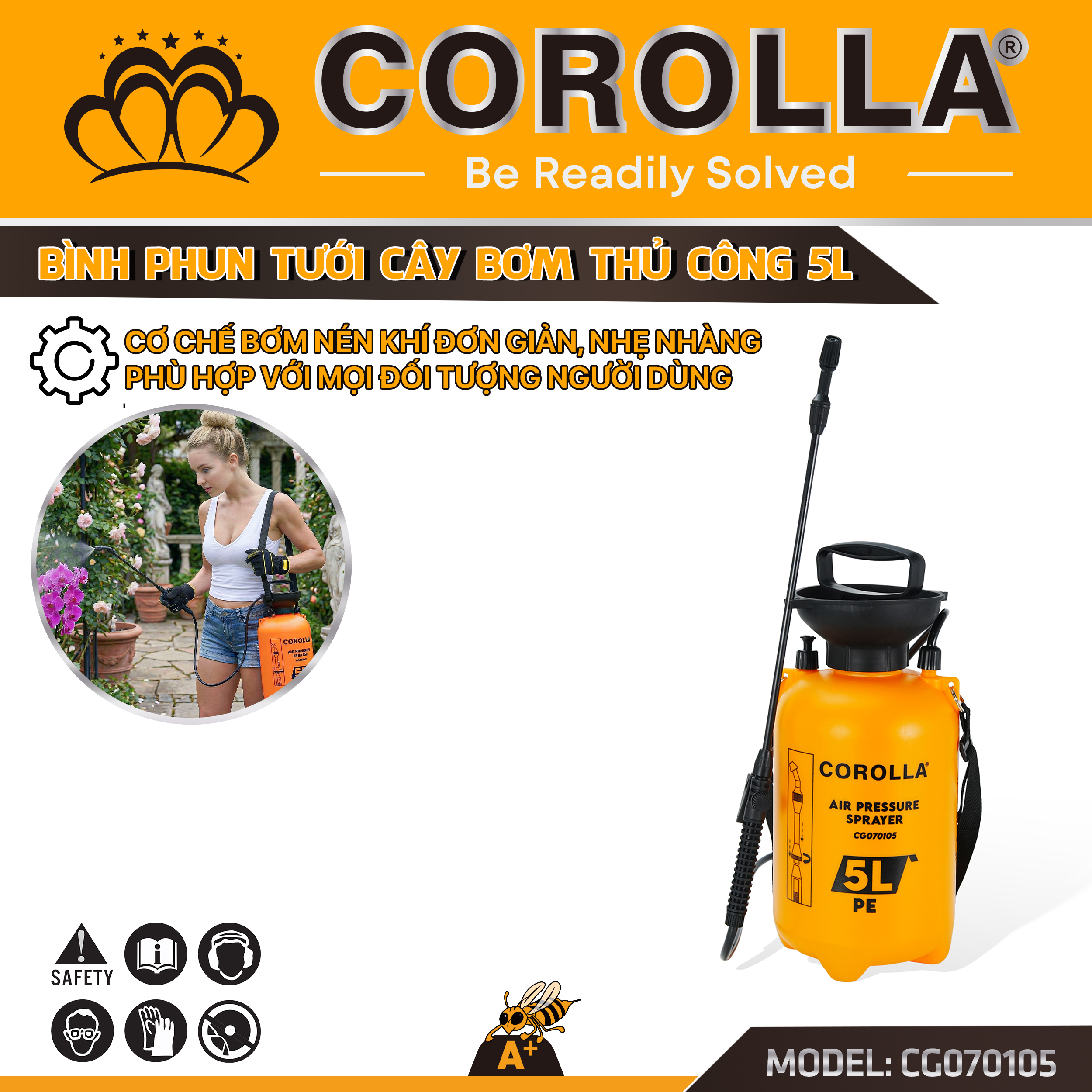 Bình phun tưới cây bơm thủ công 5L COROLLA là dòng bình phun nén khí thủ công nhỏ gọn, được thiết kế cho các công việc đòi hỏi sự tỉ mỉ và linh động cao. Với kết cấu chắc chắn và cơ chế tạo áp suất nhanh, đây là công cụ hỗ trợ đắc lực cho các tác vụ chăm sóc không gian xanh quy mô nhỏ.