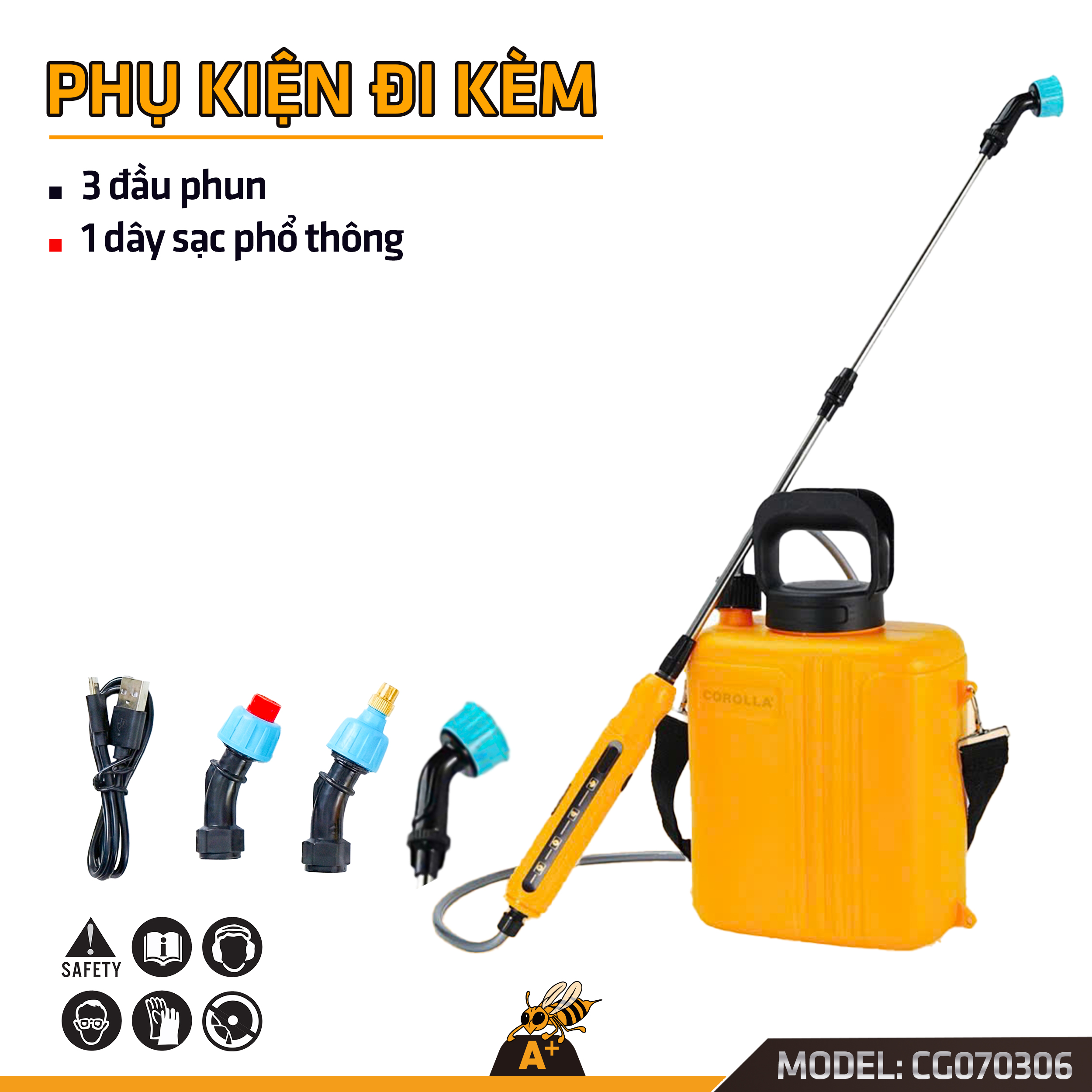 Phụ kiện: 3 đầu phun chuyên dụng, 1 dây sạc phổ thông.