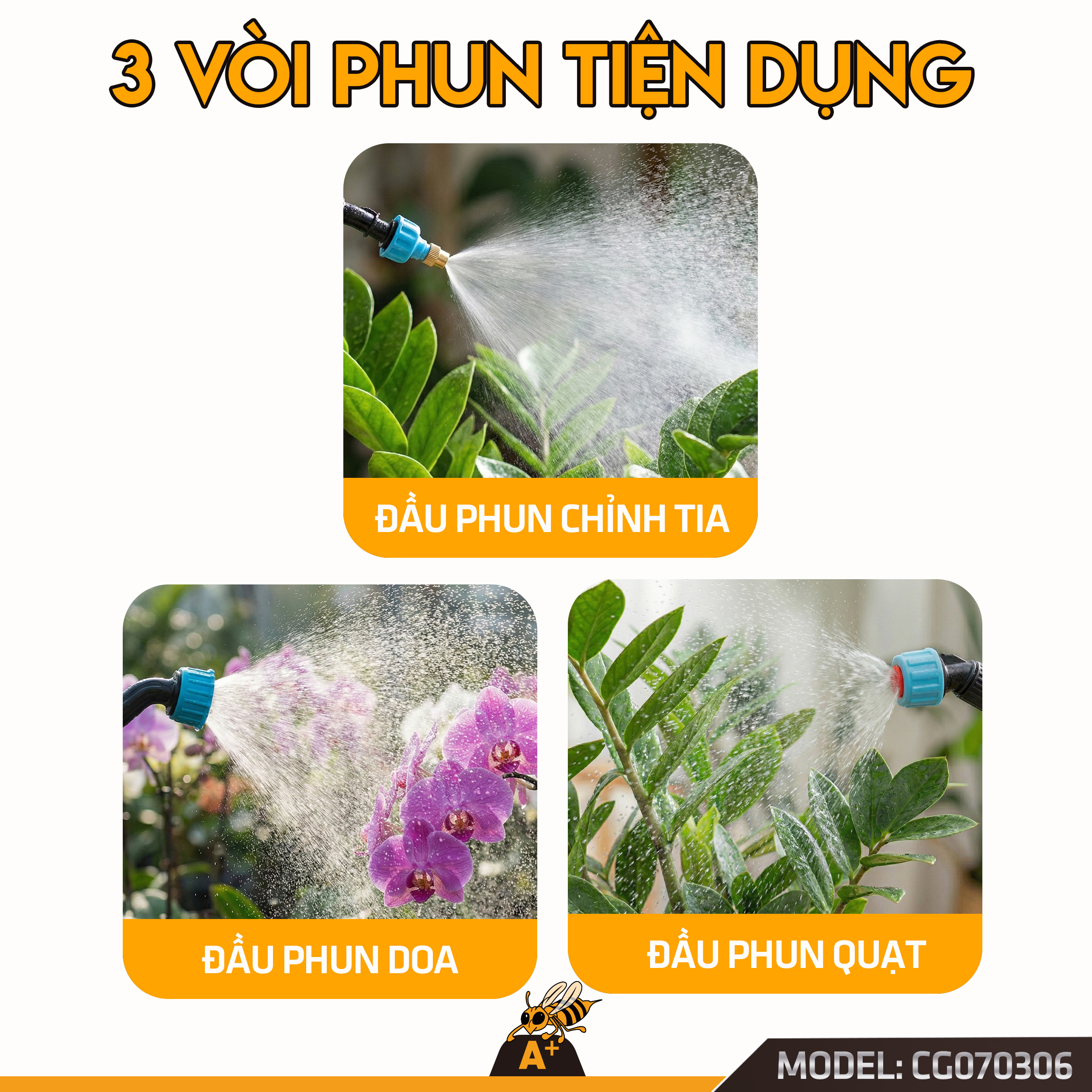 Đầu phun đa năng: 3 béc phun đi kèm cho phép thay đổi luồng phun tùy theo mục đích sử dụng.