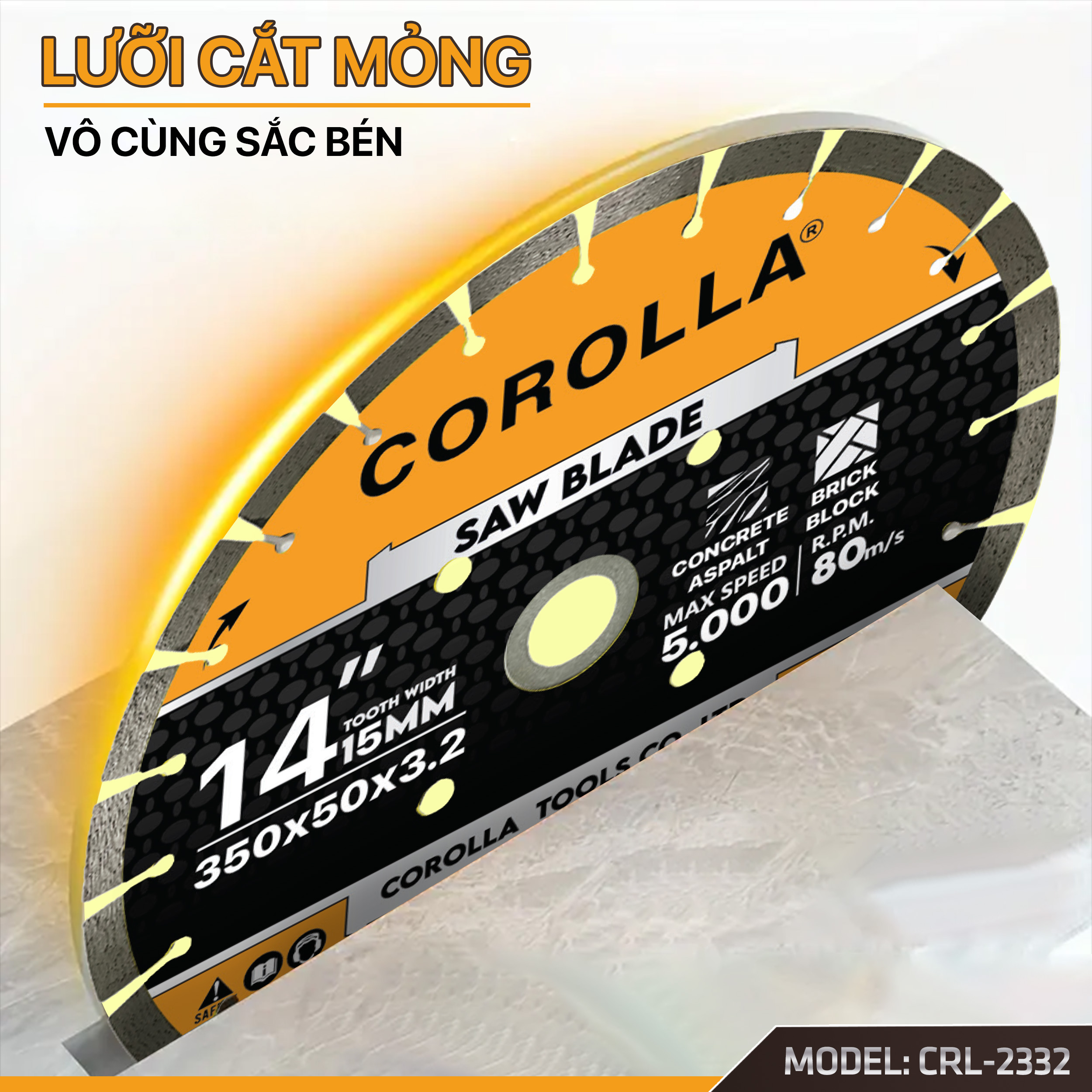 Lưỡi cưa đá, cắt gạch và cắt đường bê tông phi 350mm là một trong những mặt hàng thuộc danh mục Kim Khí- Dụng Cụ Cầm Tay mà công ty Duy Linh đang phân phối. Thương hiệu COROLLA không còn xa lạ với quý khách hàng trên thị trường Việt Nam. Một trong những sản phẩm bán chạy nhất về Đá cắt, đá mài, nhám xếp, lưỡi cắt gạch, lưỡi cắt gỗ…